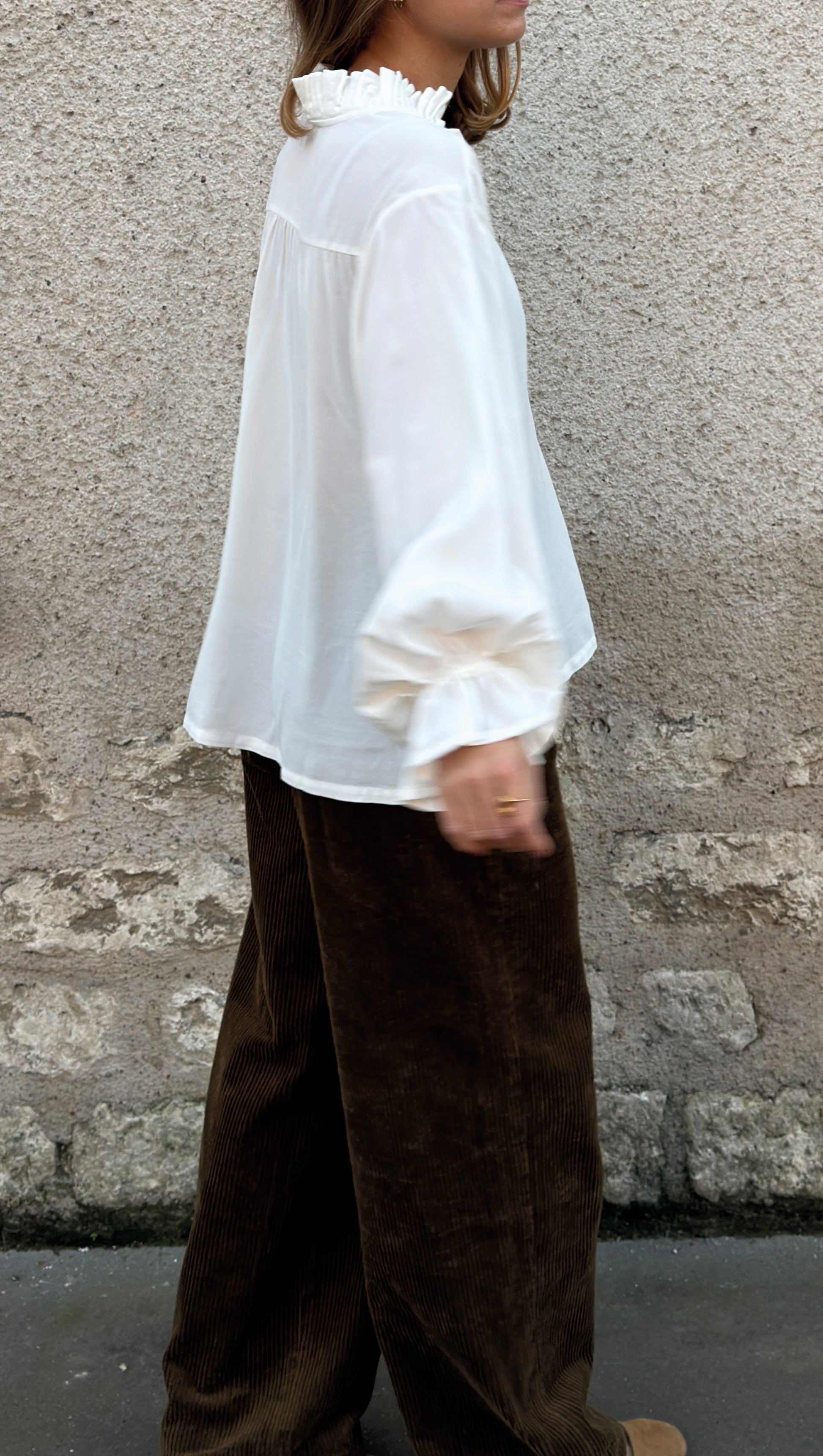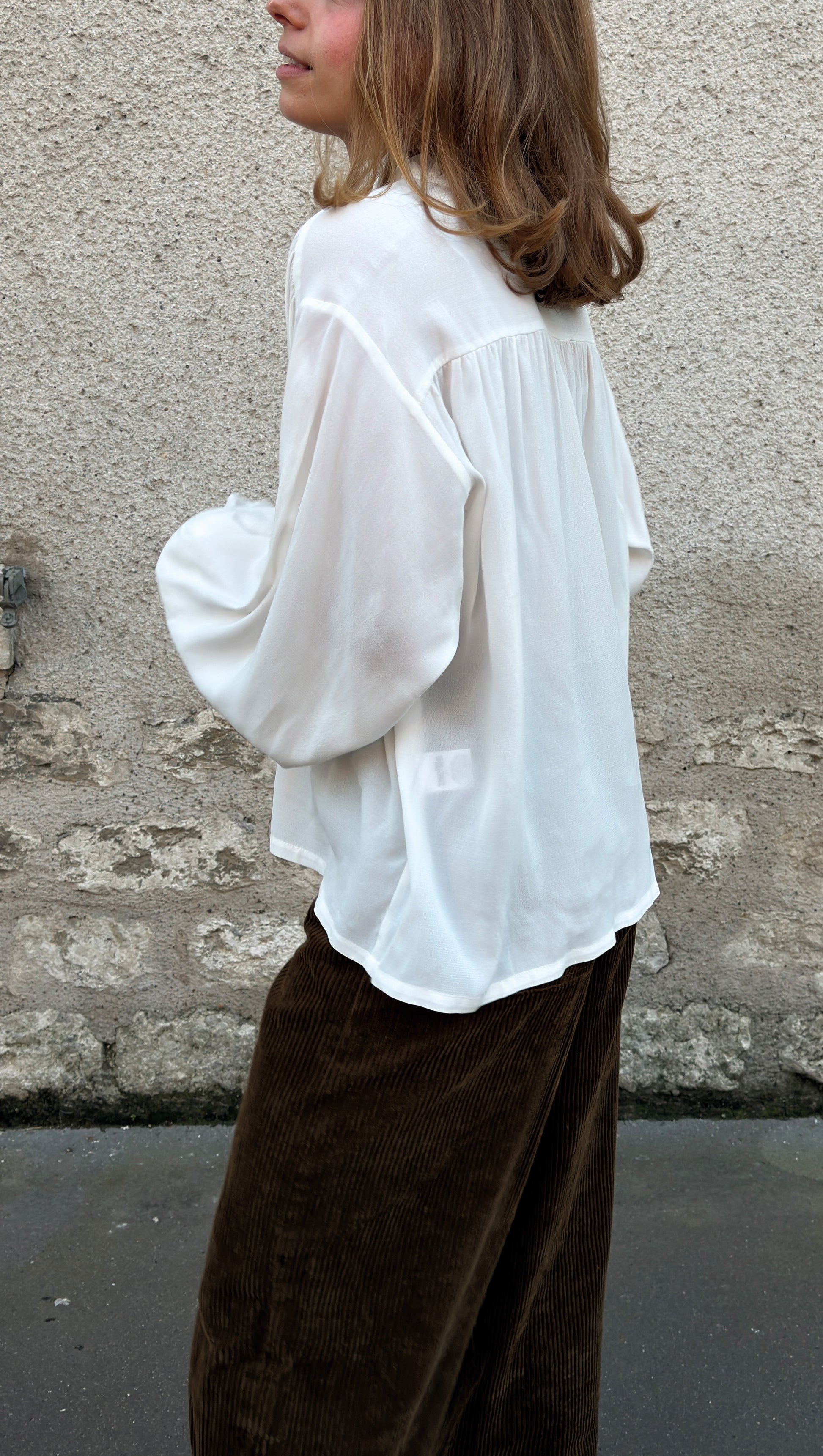 Chemisier oversize à la coupe droite. Encolure ronde avec un col surmonté d’une fronce. Manches longues. Poignets resserrés par une fronce pour un effet bouffant. Boutonnage sur toute la hauteur devant.