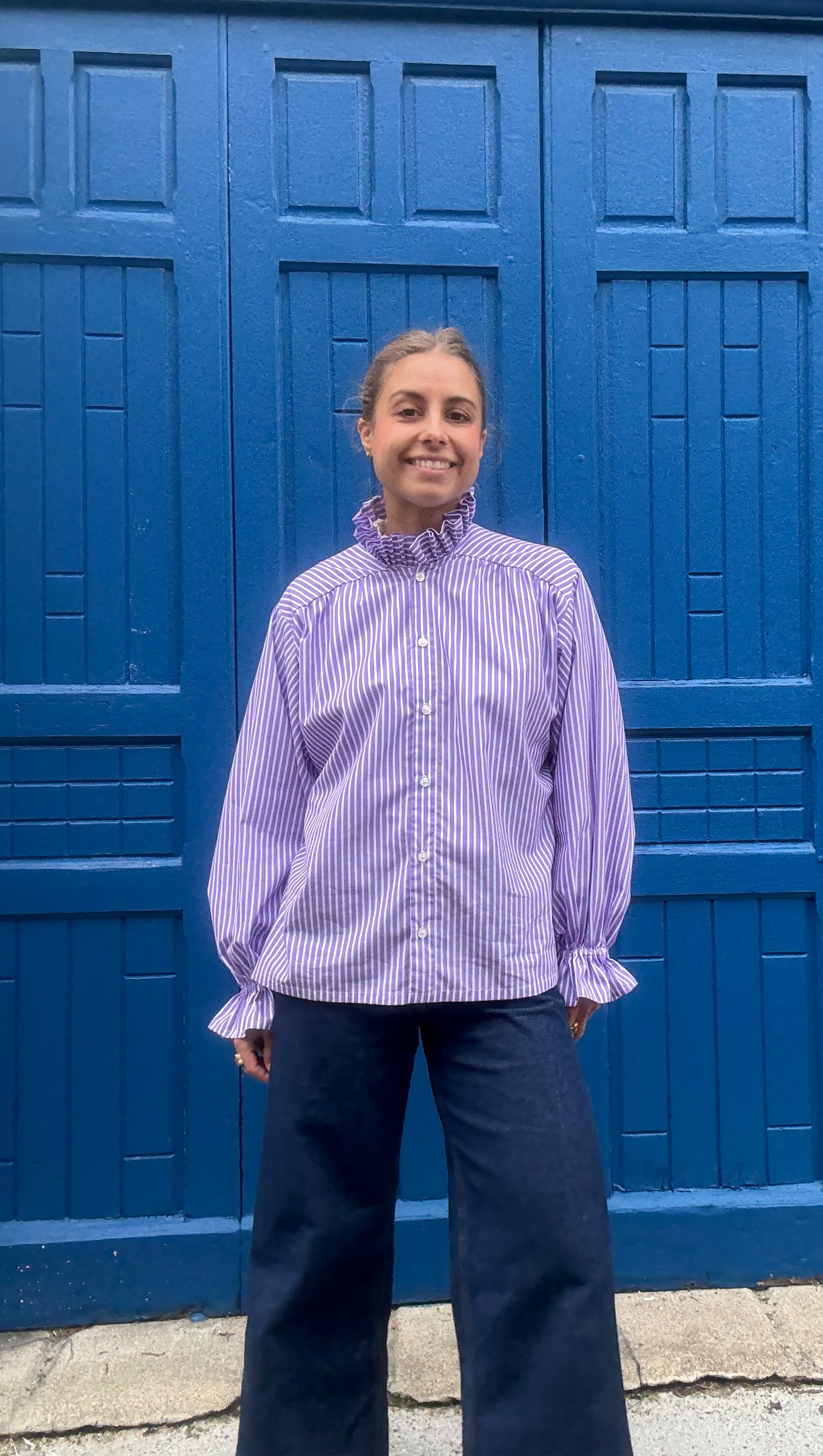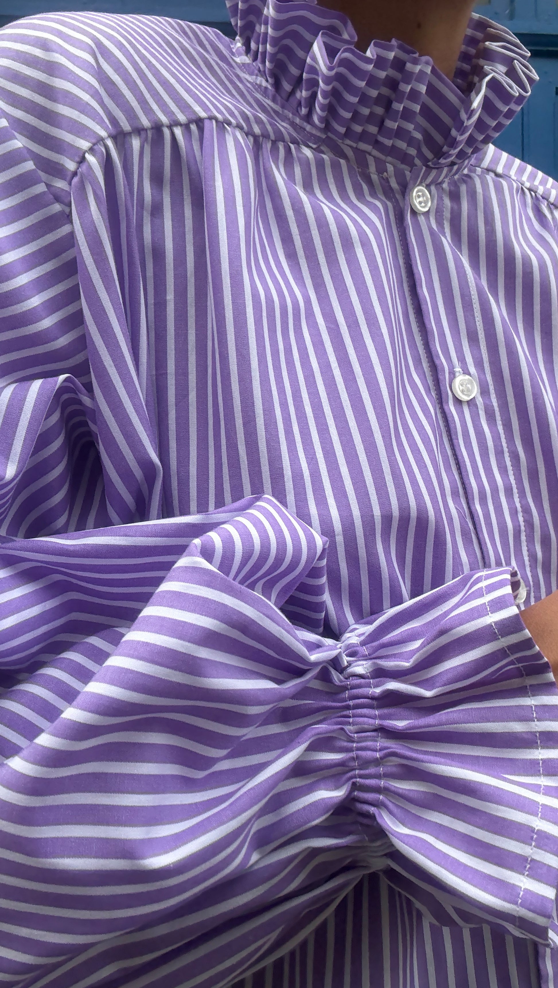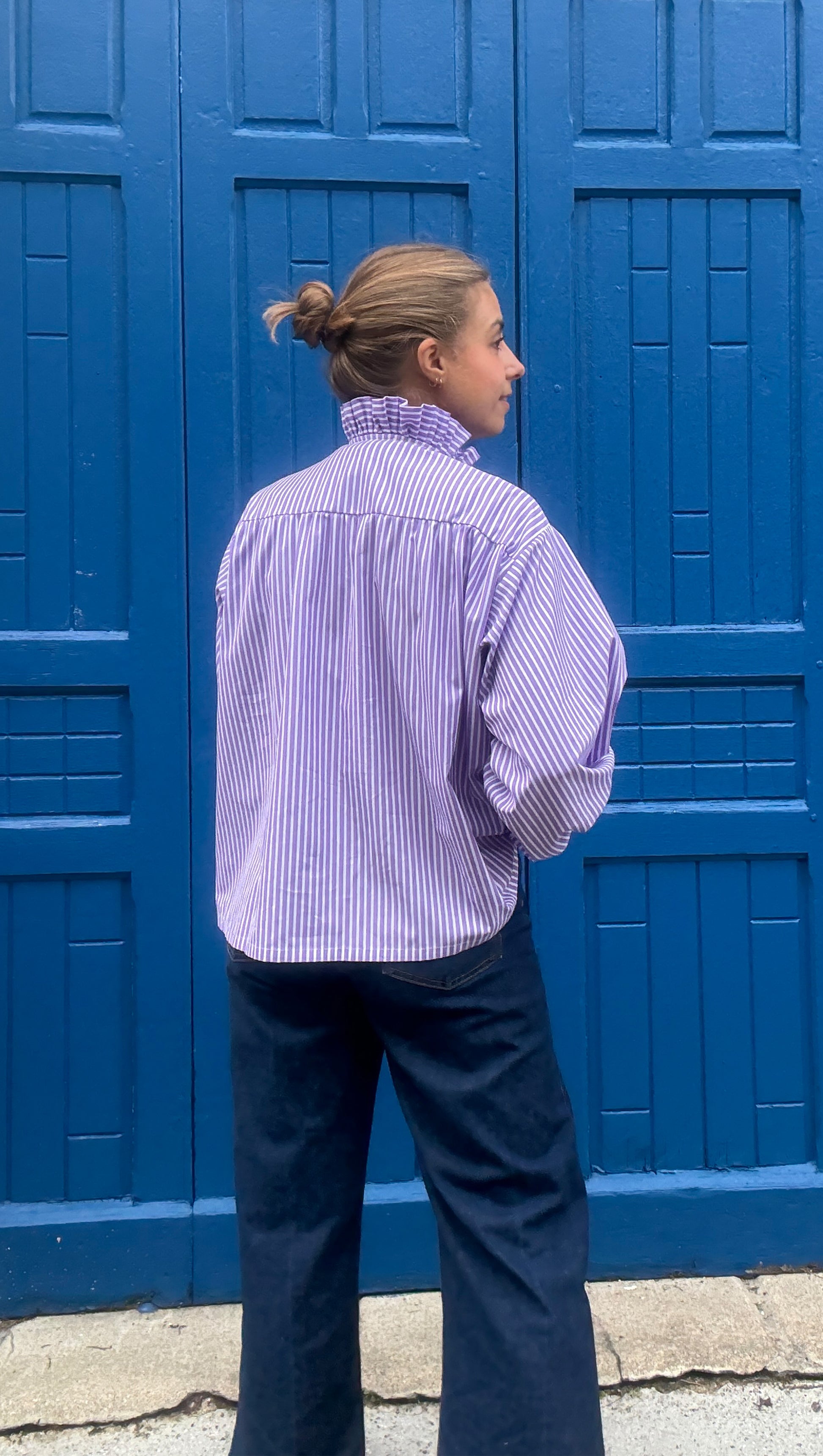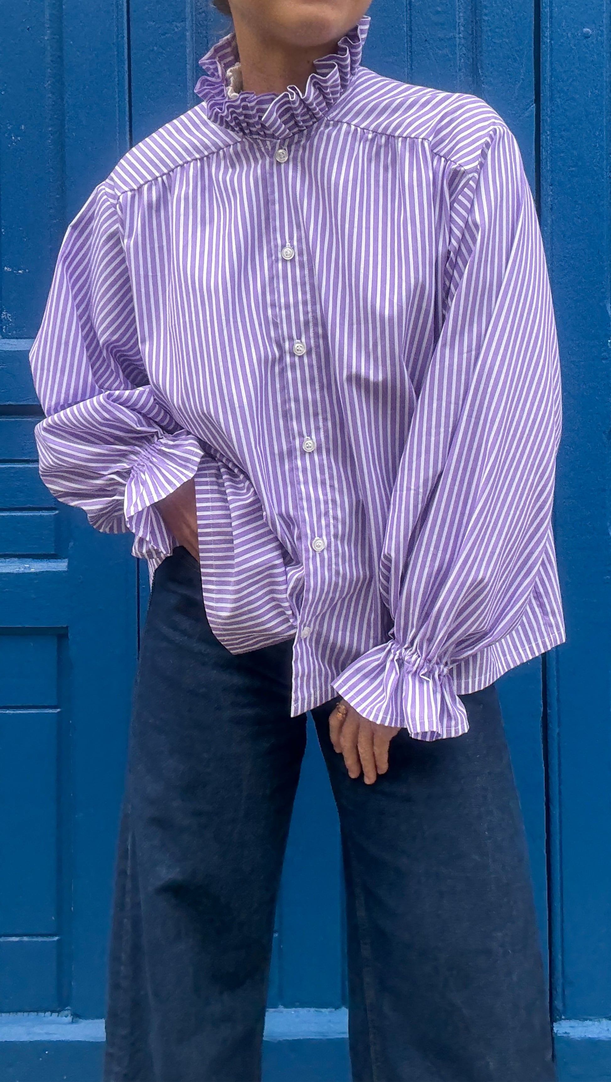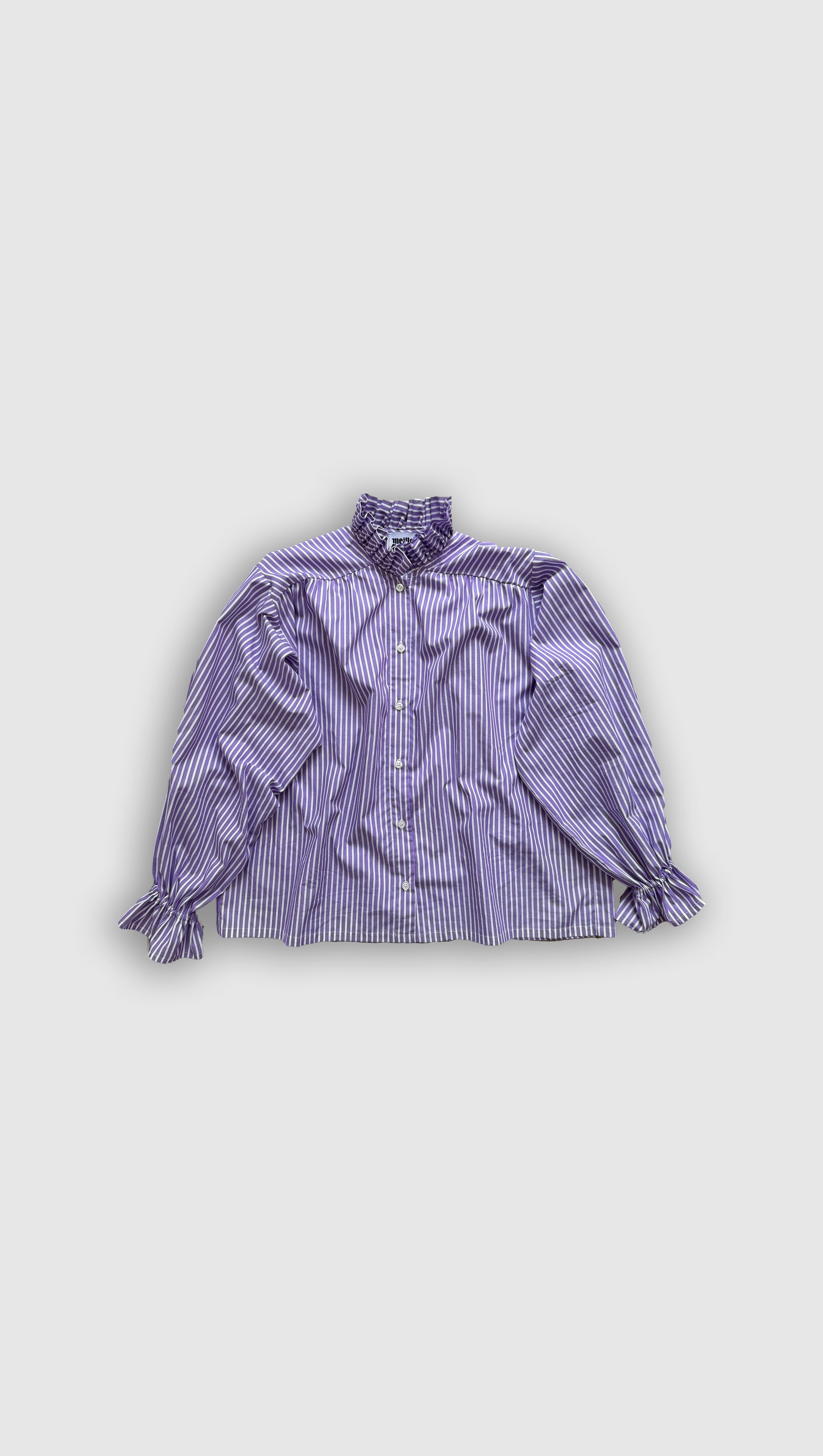 Chemisier oversize à la coupe droite. Encolure ronde avec un col surmonté d’une fronce. Manches longues. Poignets resserrés par une fronce pour un effet bouffant. Boutonnage sur toute la hauteur devant.