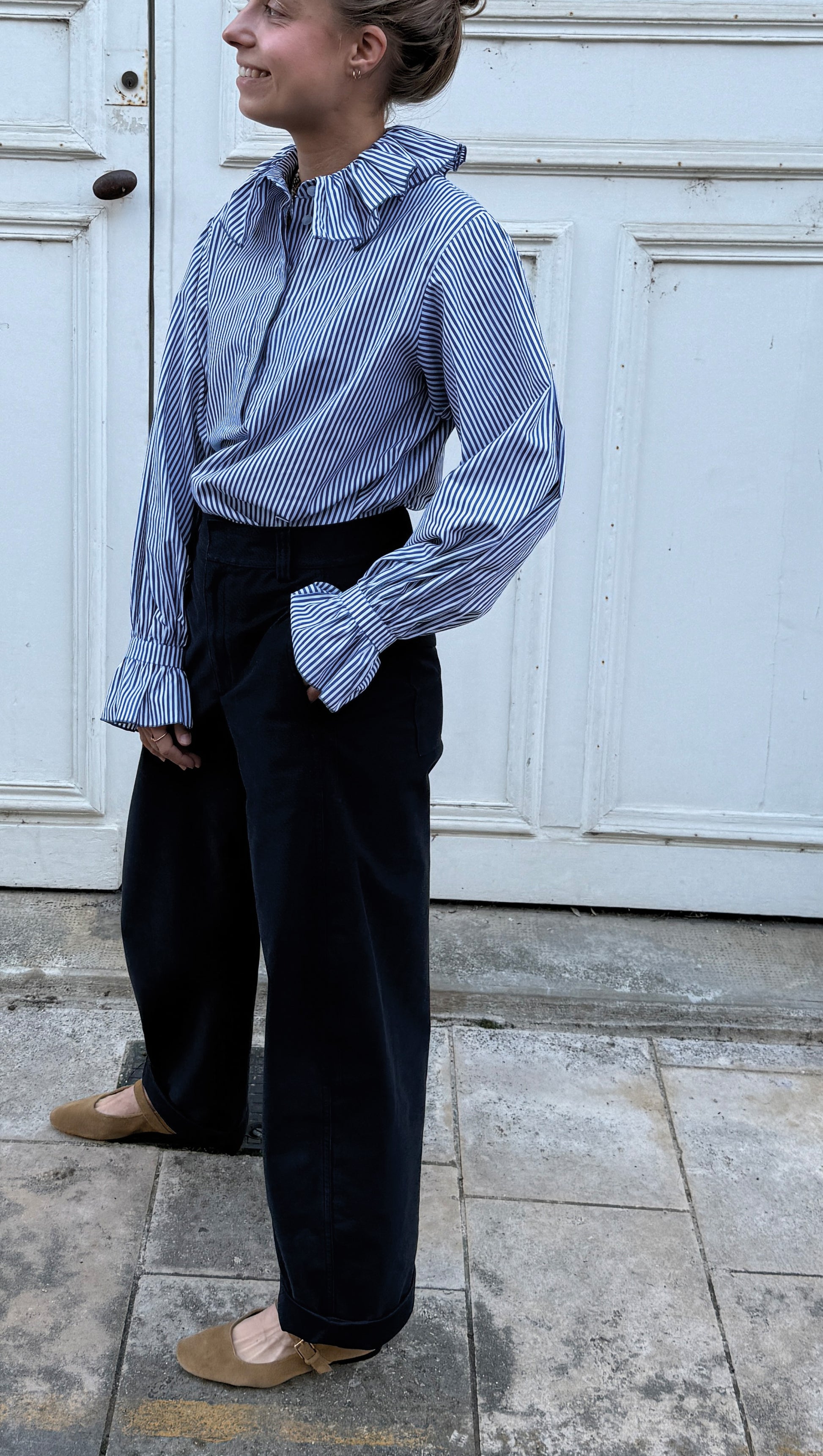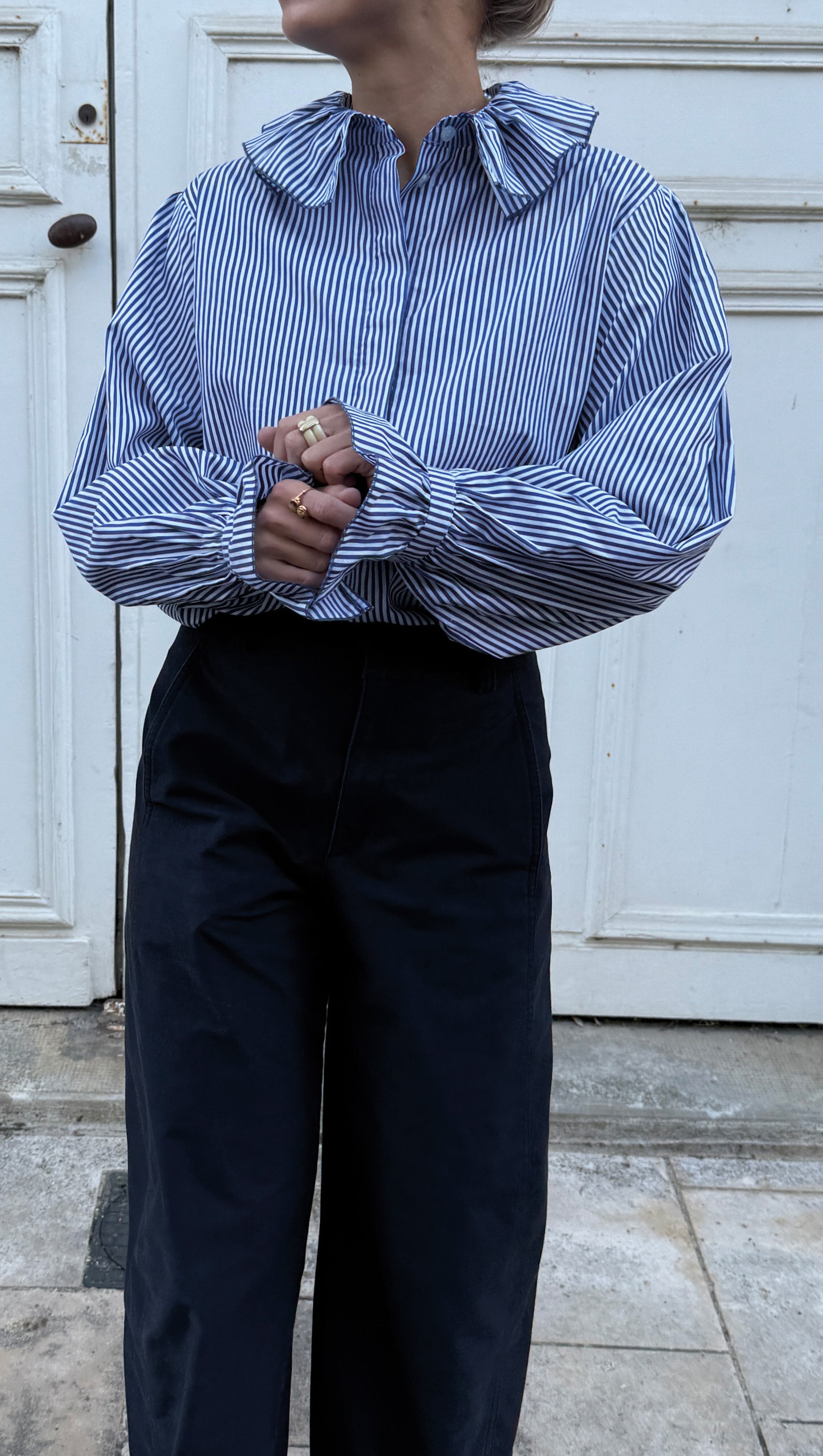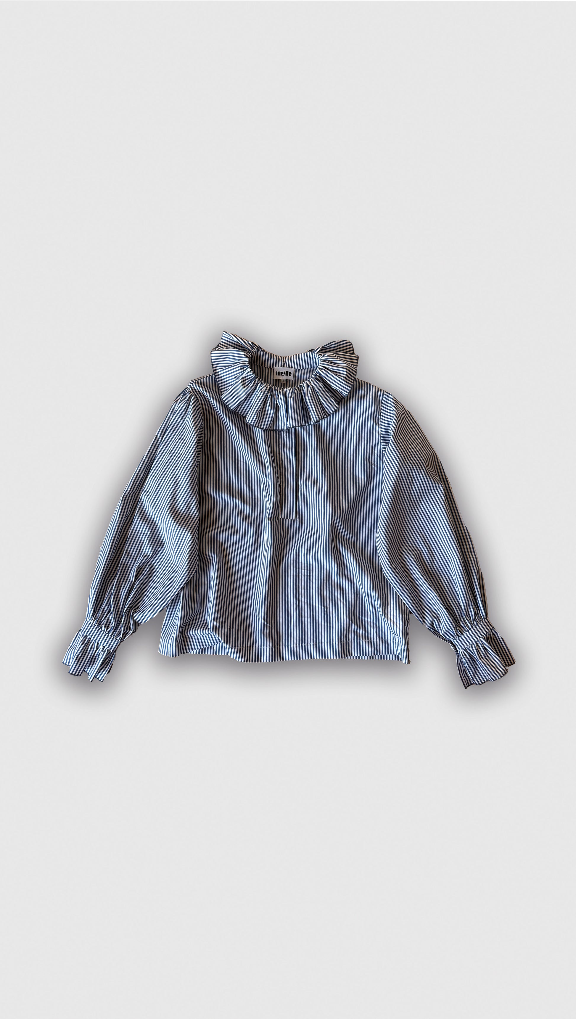 Chemisier col polo à manches longues. Coupe droite. Ouverture milieu devant sur la moitié du corps par des boutons. Large col volant positionné sur un pied de col. Poignets de manches au détails froncés qui s'ouvrent par un bouton.
