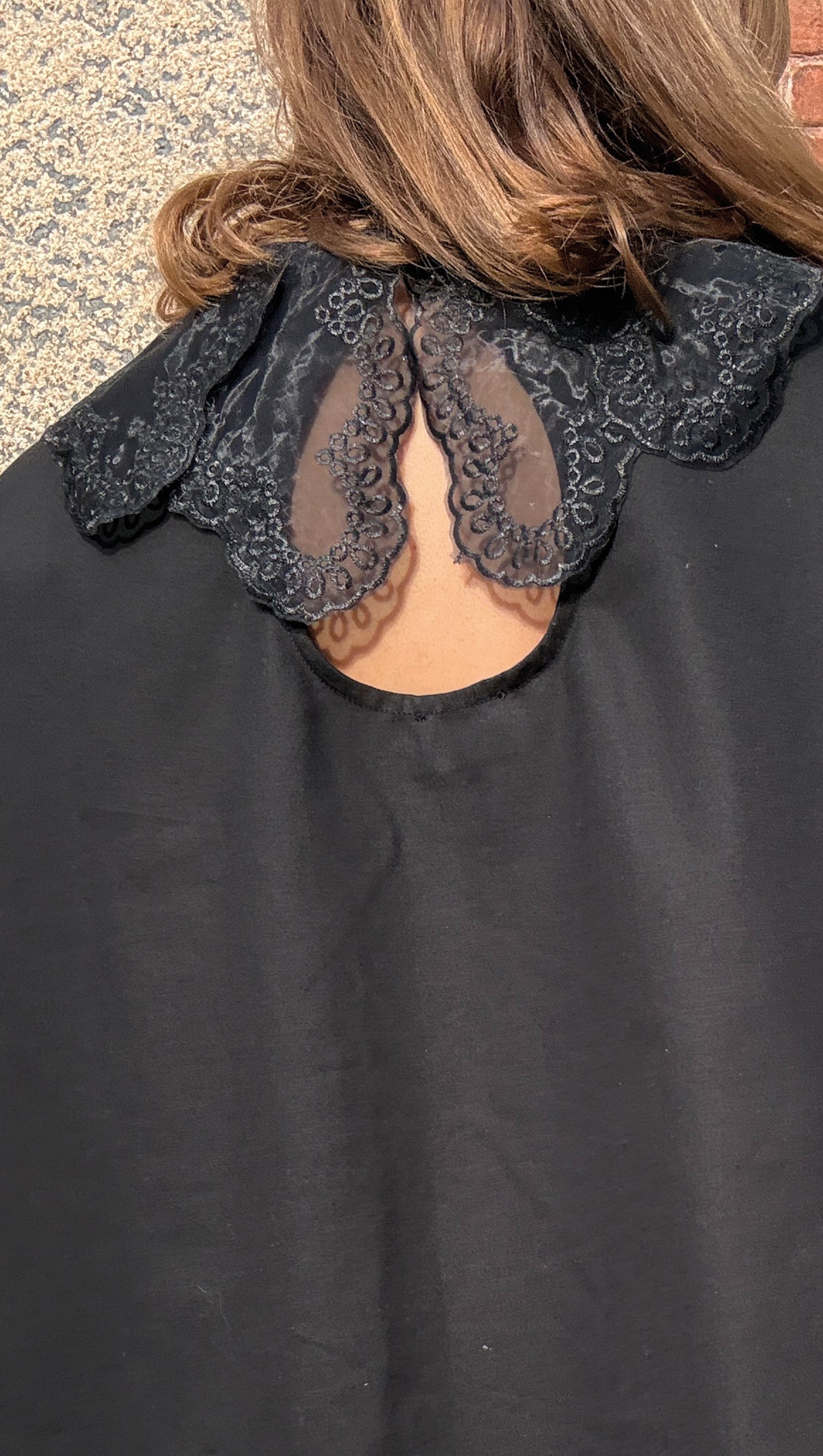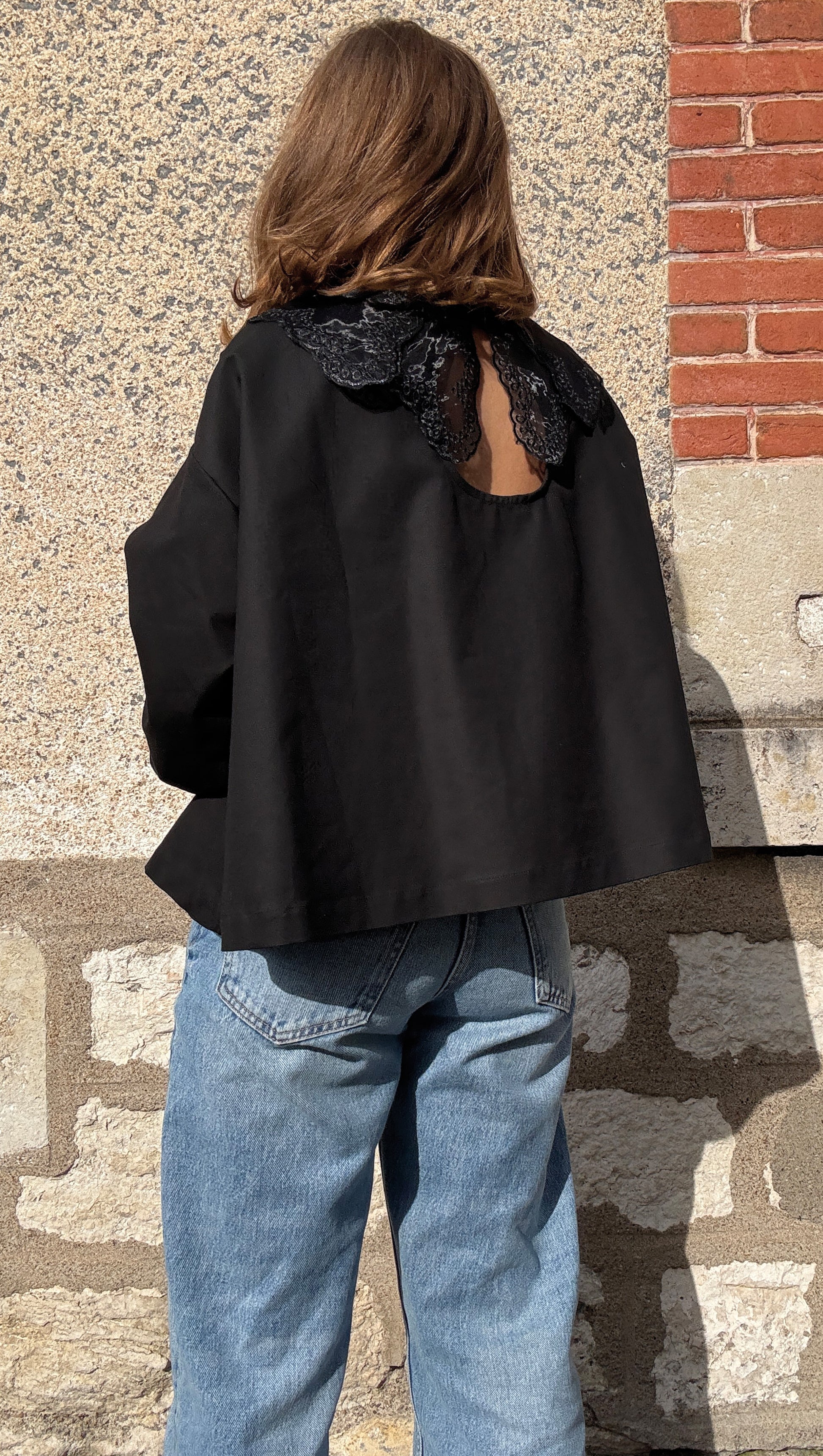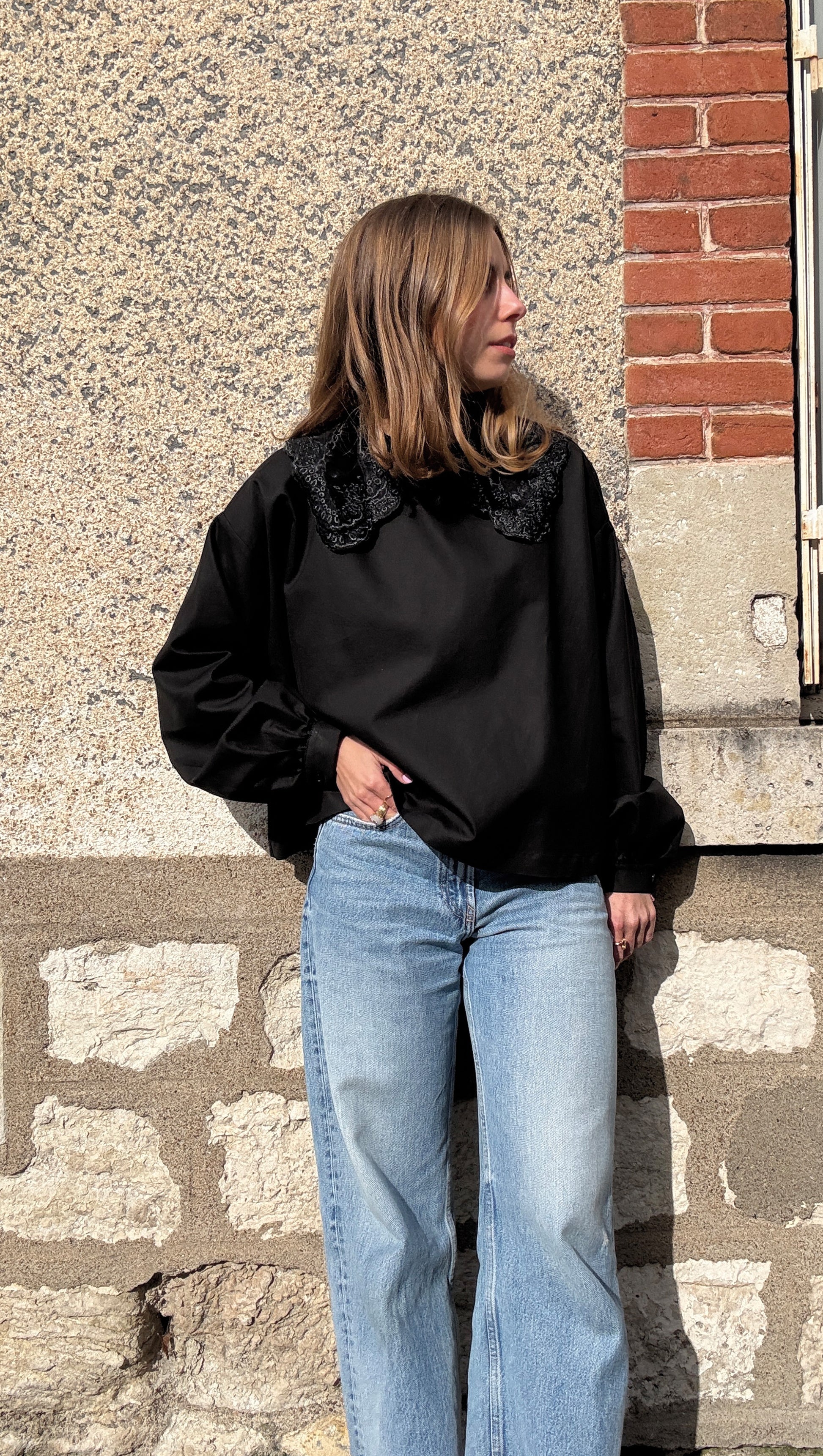 Chemisier ample à la coupe droite. Épaules tombantes et manches bouffantes resserrées aux poignets et ouverture par un bouton. Double col en dentelle noir sur l'encolure ronde. Ouverture dans le dos avec une goutte et un bouton.