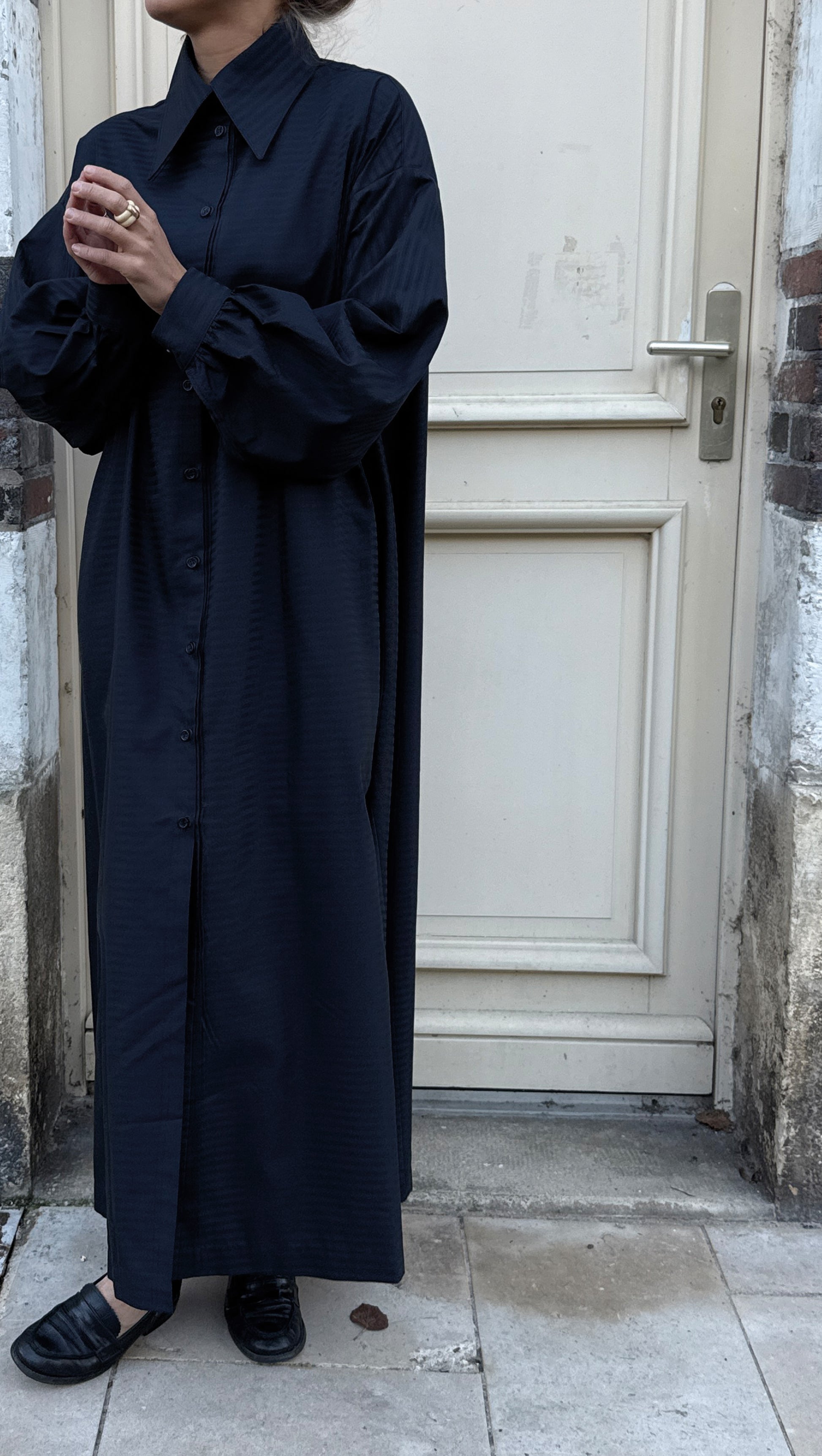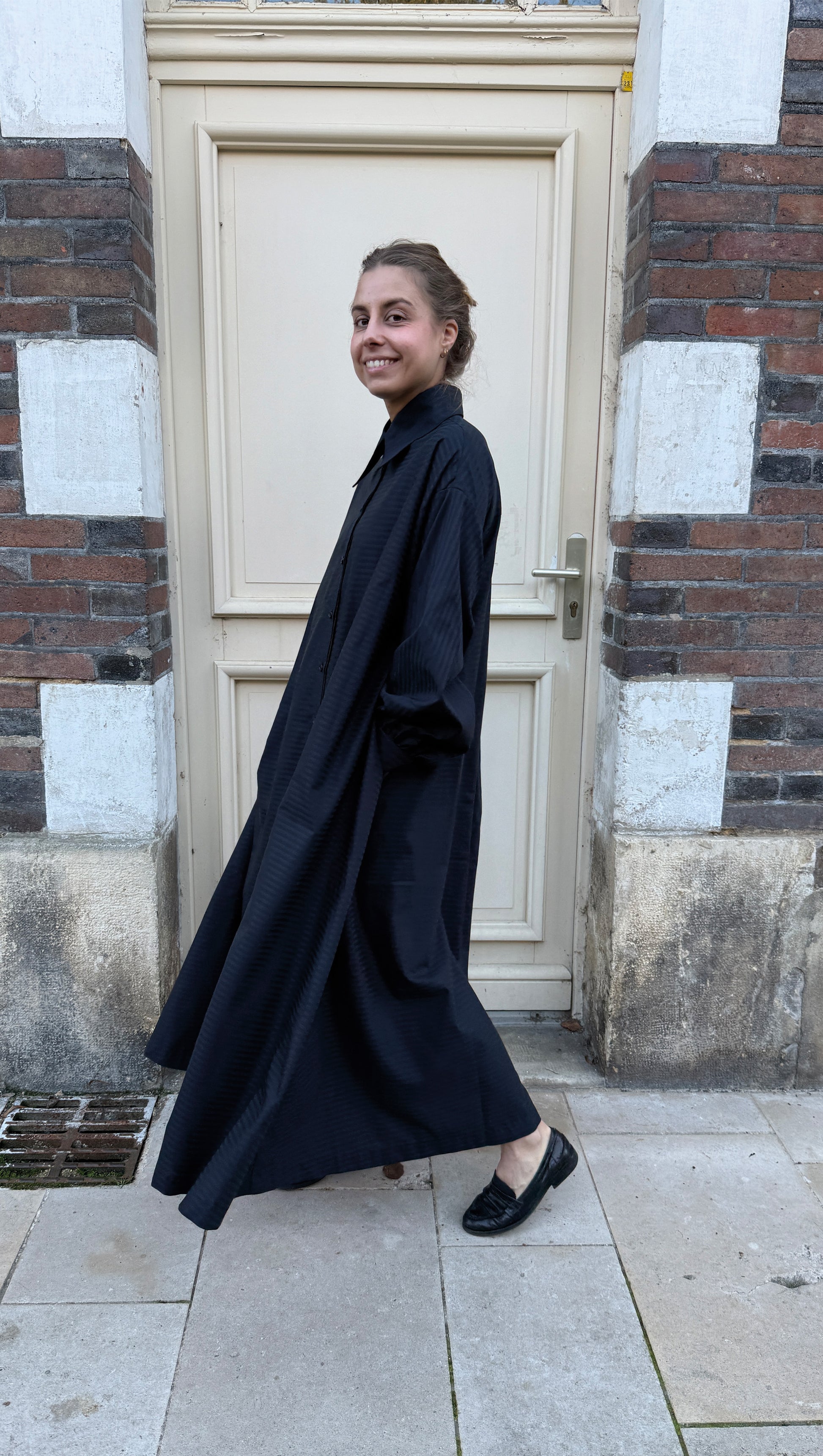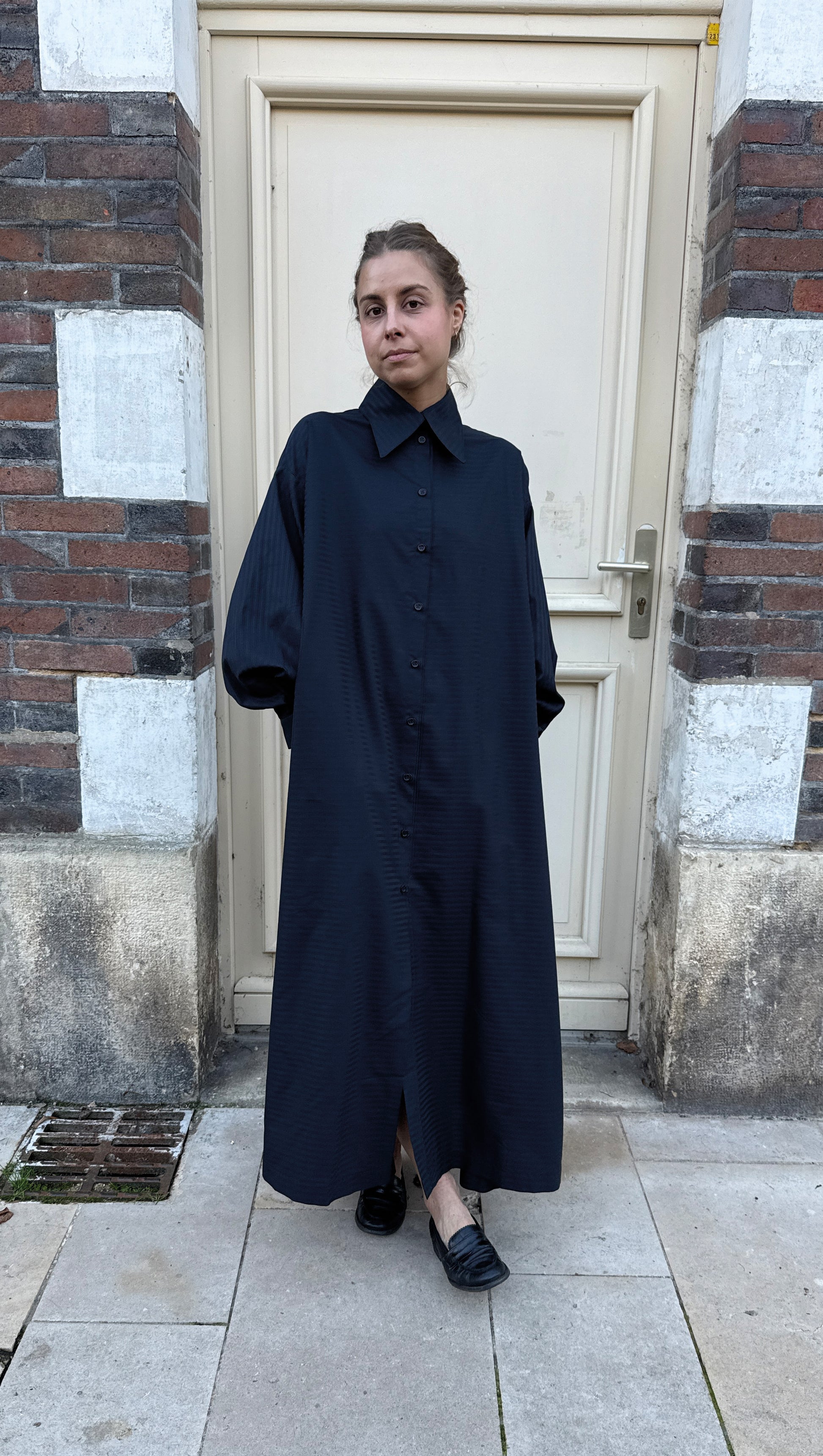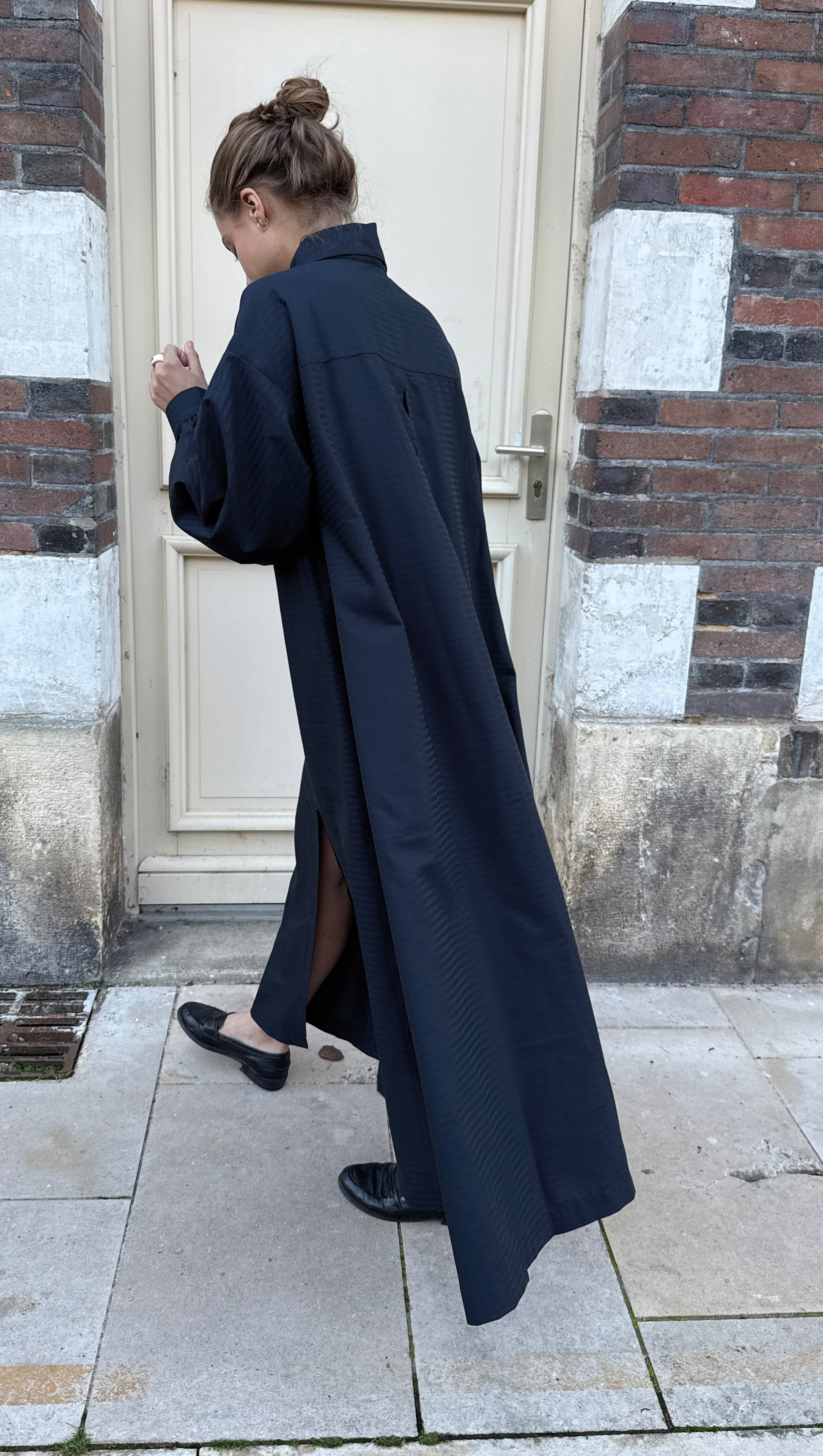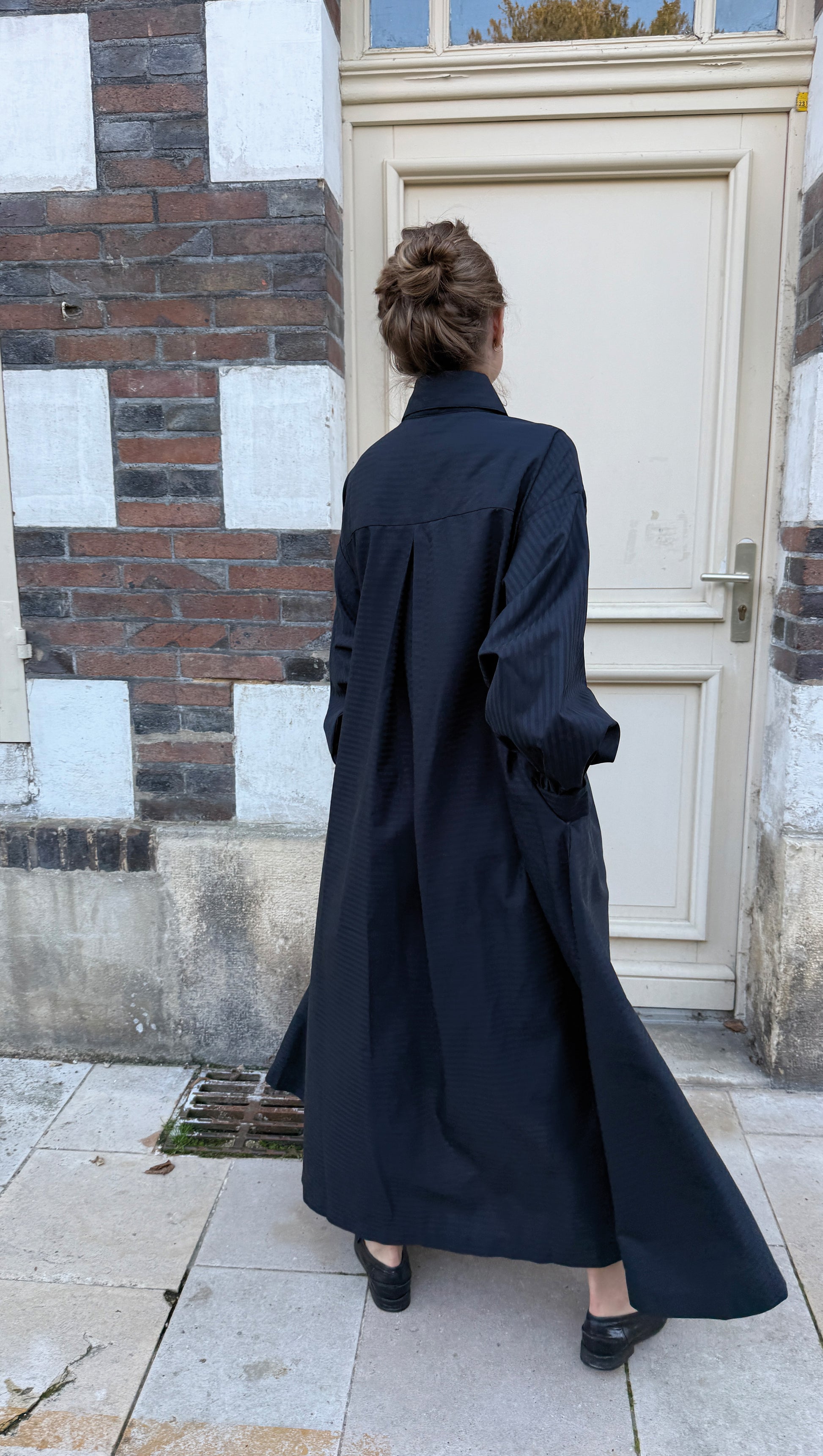 Robe chemise longue à la coupe oversize. Col chemise avec une ouverture sur le milieu devant boutonné sur la hauteur. Manches longues froncées sur le poignet. Pli creux profond au milieu dos. Poches invisible de chaque côté.